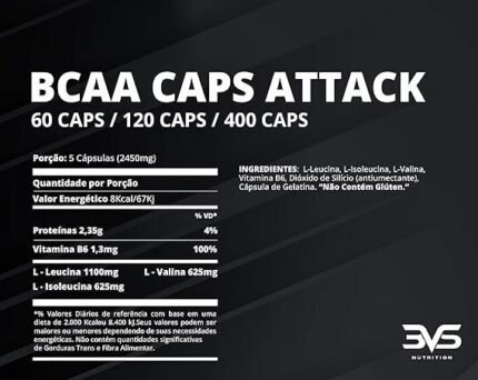 BCAA Attack da 3VS Nutrition é um suplemento alimentar em cápsulas com fórmula que apresenta bcaa’s (aminoácidos de cadeia ramificada):