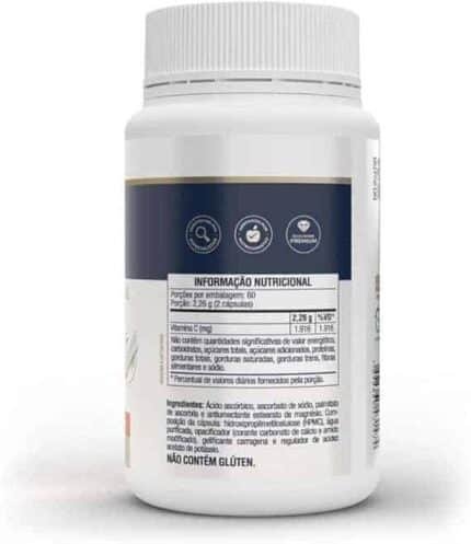 Suplemento alimentar de vitamina C em cápsulas. Suplemento alimentar composto pela combinação de três diferentes fontes de Vitamina C: ácido
