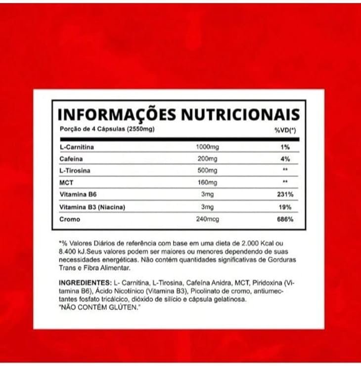L- Carnitina, L-Tirosina, Cafeína Anidra, MCT, Piridoxina (Vitamina B6), Ácido Nicotínico (Vitamina B3), Picolinato de cromo, antiumectantes fosfato tricálcico, dióxido de silício e cápsula gelatinosa.