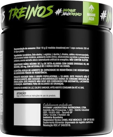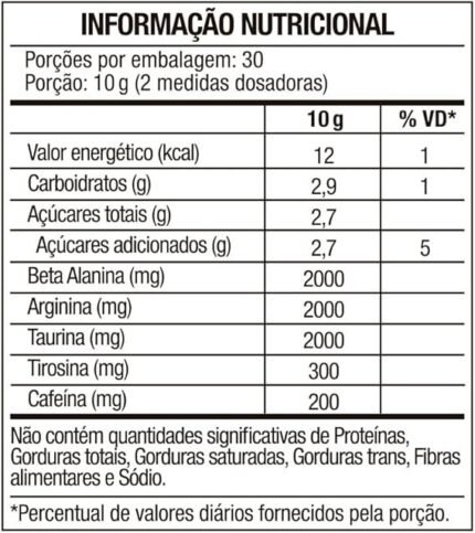 Maltodextrina, creatina monohidratada, taurina, arginina, cafeína, aromatizantes, antiumectante dióxido de silício, edulcorante sucralose, emulsificante goma xantana e corante artificial vermelho 40. NÃO CONTEM GLÚTEN.