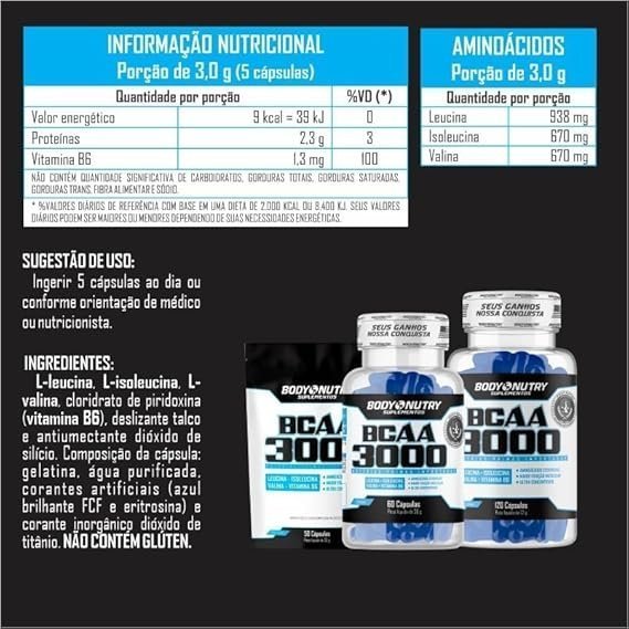 BCAA 3000 120 Capsulas Aminoacidos Essenciais Enriquecido com vitamina B6 Sem Sabor Ultra Concentrado Rapida Absorção Importado Original