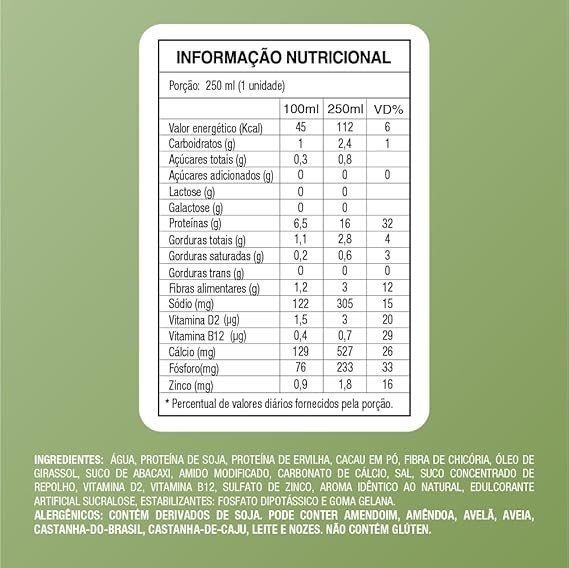 | Ingredientes | Ingredientes: Água, Proteína de soja, Proteína de ervilha, Cacau em pó, Fibra de chicória, Suco concentrado de abacaxi, Amido modificado, Óleo de girassol, Carbonato de cálcio, Sal, Suco concentrado de repolho, Vitamina D2, Vitamina B12, Aroma idêntico ao natural, Edulcorante artificial sucralose, Estabilizantes: goma gelana e fosfato dipotássico. |
