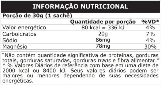 Maltodextrina, água deionizada, amido de milho ceroso (waxy maize), taurina (93mg/23,6ml), glucoronolactona (58mg/23,6ml), cafeína (8,1mg/23,6ml), inositol (4,6mg/23,6ml), nicotinamida (niacina), D-pantotenato de cálcio (ácido pantotênico), cloridrato de piridoxina (vitamina B6), riboflavina (vitamina B2), cianocobalamina (vitamina B12), reguladores de acidez: citrato monossódico e ácido fosfórico, conservadores: sorbato de potássio e benzoato de sódio e edulcorantes: sucralose e acessulfame de potássio. NÃO CONTÉM GLÚTEN.