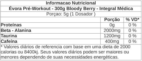 Beta-alanina, taurina, cafeína, acidulante ácido cítrico, aromatizante, antiumectante dióxido de silício, edulcorante sucralose e corante ponceau 4R.
