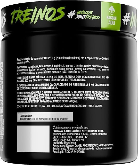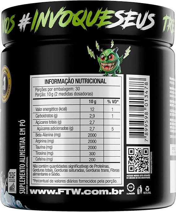 Desperte seu potencial máximo com Diabo Verde #Pre-Workout da FTW, um suplemento alimentar formulado especialmente para quem busca mais energia, foco e desempenho durante os treinos. Sua fórmula combina aminoácidos essenciais com cafeína microencapsulada, proporcionando estímulo de forma gradual e duradoura. Ideal para ser consumido antes das atividades físicas, esse pré-treino é indicado para atletas e praticantes de atividades intensas, sempre com orientação de um profissional habilitado. BENEFÍCIOS: 💪 Fórmula Energizante: Com cafeína microencapsulada para liberação gradual, ideal para manter o foco e a disposição. ⚡ Aminoácidos de Alta Qualidade: Contém beta-alanina, L-arginina, L-taurina e L-tirosina. 🧪 Isomaltulose: Carboidrato de baixo índice glicêmico que auxilia no fornecimento de energia sustentada. 🔁 Rendimento Inteligente: Pote com 300g rende aproximadamente 30 porções. ✅ Sem Glúten: Seguro para quem possui restrições alimentares. COMO CONSUMIR: Dilua 2 medidas dosadoras (10g) em 200ml de água gelada e consuma 30 minutos antes do treino. A dose diária máxima de beta-alanina é de 2g, podendo ser fracionada com no mínimo 2 horas entre as porções. INFORMAÇÕES IMPORTANTES: Produto indicado para adultos (≥ 19 anos). Não deve ser consumido por gestantes, lactantes ou crianças. Este produto não é um medicamento. Conserve em local seco, fresco e protegido da luz. Após aberto, consumir em até 45 dias. Não exceda a recomendação diária indicada na embalagem. Mantenha fora do alcance de crianças.