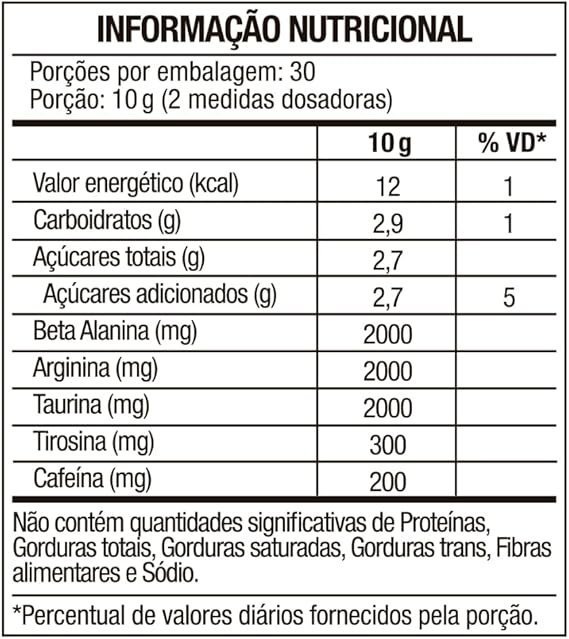 Isomaltulose, beta-alanina, L-arginina, L-taurina, L-tirosina, cafeína microencapsulada, antiumectante fosfato tricálcico, acidulante ácido cítrico, edulcorantes sucralose e acessulfame de potássio, aromatizante e corante (conforme o sabor). NÃO CONTÉM GLÚTEN.
