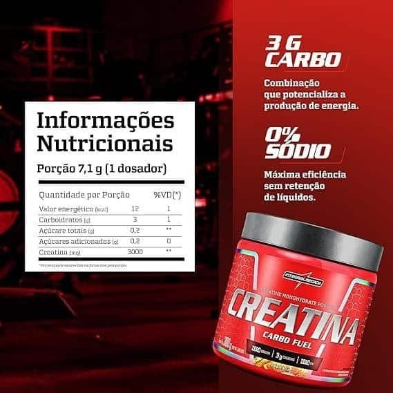 Creatina monohidratada, maltodextrina, acidulante ácido cítrico, antiumectante dióxido de silício, aromatizante, edulcorante sucralose e corante amarelo crepúsculo FCF.
