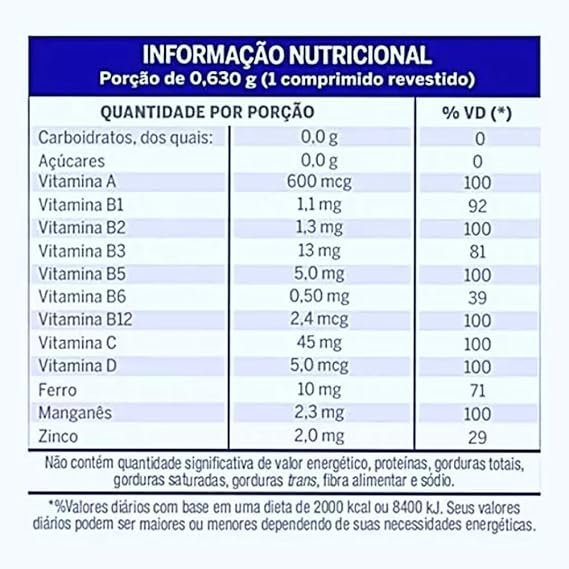ácido ascórbico, sulfato ferroso, nicotinamida, sulfato de zinco, sulfato de manganês, d-pantotenato de cálcio, acetato de retinol, cloridrato de tiamina, riboflavina, cloridrato de piridoxina, colecalciferol, cianocobalamina, estabilizantes celulose microcristalina e croscarmelose sódica, antiumectante dióxido de silício, revestimento (estabilizante hidroxipropilmetilcelulose, agente de corpo etilcelulose, umectante triacetina, corantes inorgânicos dióxido de titânio e óxido de ferro vermelho, corante natural carmim, corantes artificiais ponceau 4R, vermelho 40, bordeaux S, amarelo de quinoleína e amarelo crepúsculo)
