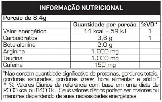 | Aditivos | Taurina, Beta-alanina, Cafeína, L-arginina |