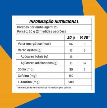 Palatinose; L-Taurina; Cafeína anidra; Acidulante ácido cítrico; Gengibre em pó; Aroma idêntico ao natural; Corante natural de beterraba; Espessante goma xantana; Edulcorantes naturais (stevia e xilitol).