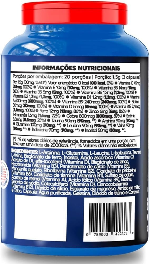 L-Arginina, L-Glutamina, L-Leucina, L-Isoleucina, Taurina, L-Valina, Bisglicinato de Ferro