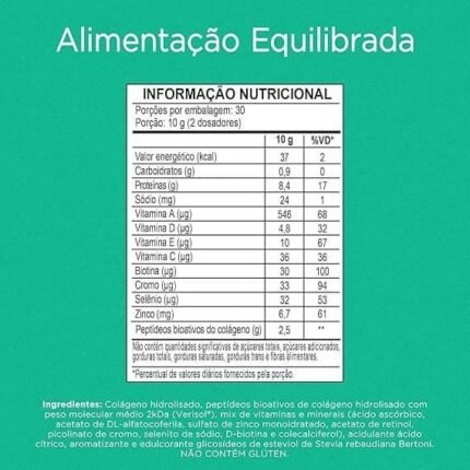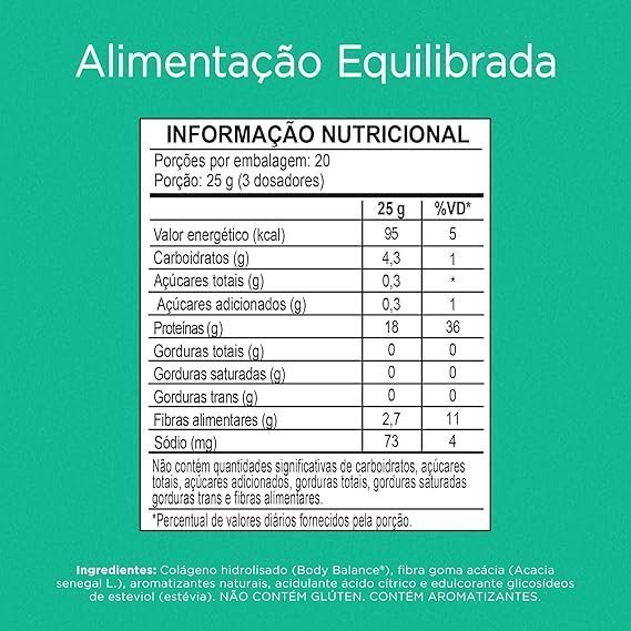 Colágeno hidrolisado (Body Balance®), fibra goma acácia (Acacia senegal L.), aromatizantes naturais, acidulante ácido cítrico e edulcorante glicosídeos de esteviol (estévia). NÃO CONTÉM GLÚTEN. CONTÉM AROMATIZANTE.