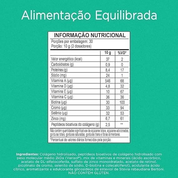 : Colágeno hidrolisado, colágeno hidrolisado bioativo (Verisol®), mix de vitaminas e minerais [vitamina C (ácido ascórbico), vitamina E (DL alfa-acetato de tocoferol), zinco (sulfato de zinco mono-hidratado), vitamina A (acetato de retinol), cromo (picolinato de cromo), selênio (selenito de sódio), vitamina H (biotina) e vitamina D (colecalciferol)], acidulante ácido cítrico, aroma sintético idêntico ao natural, edulcorante estévia e corante betacaroteno
