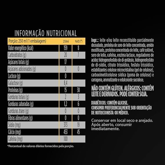 Ingredientes ‎Ingr.: ​​​​leite e/ou leite reconstituído parcialmente desnatado, proteína concentrada de leite, proteína de soro de leite concentrada, amido modificado, café solúvel, soro de leite, cafeína, estabilizantes celulose microcristalina, citrato de sódio, carboximetilcelulose sódica e goma gelana, reguladores de acidez fosfato dipotássico e fosfato dissódico, aromatizante e edulcorante sucralose