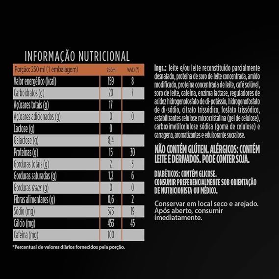 Ingredientes ‎Ingr.: ​​​​leite e/ou leite reconstituído parcialmente desnatado, proteína concentrada de leite, proteína de soro de leite concentrada, amido modificado, café solúvel, soro de leite, cafeína, estabilizantes celulose microcristalina, citrato de sódio, carboximetilcelulose sódica e goma gelana, reguladores de acidez fosfato dipotássico e fosfato dissódico, aromatizante e edulcorante sucralose