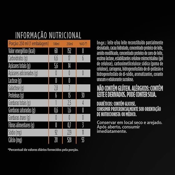 Ingr.: leite e/ou leite reconstituído parcialmente desnatado, concentrado proteico de leite, cacau hidratado, amido modificado, concentrado proteico de soro de leite, enzima lactase, aromatizantes, corante urucum, estabilizantes gel de celulose, goma de celulose, carragena, hidrogenofosfato de di-potássio e hidrogenofosfato de di-sódio e edulcorante sucralose.