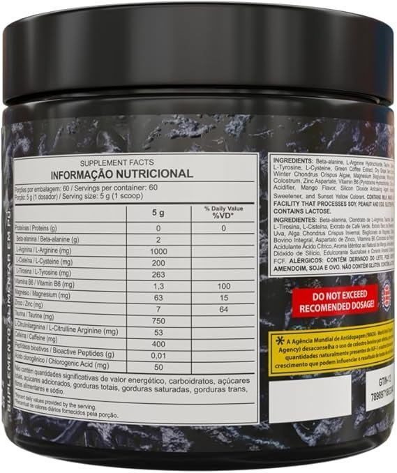 Informações sobre alergia A soja pode conter, Não contém glúten, O leite pode conter, O ovo pode conter, Os amendoins podem conter Unidades 1 unidade Porção recomendada Dissolver 5g (1 scoop) do produto em 200ml (1 copo) de água gelada e guardar em um recipiente bem fechado, para consumir conforme a sugestão de uso. Marca Dark Lab Formato Pó Descrição da faixa etária Adulto Número de unidades 1 Tamanho 300g Fabricante Dark Lab Dimensões do produto 11 x 12 x 12 cm; 300 g ASIN B0D6Z89BJS Funciona a bateria ou pilha? Não EAN 7898971863341 - Dimensões do produto : 11 x 12 x 12 cm; 300 g