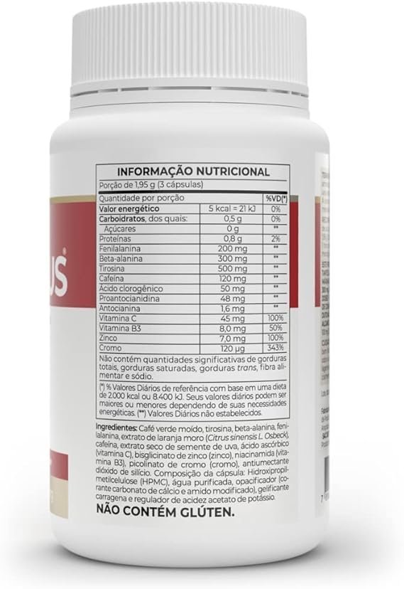 INGREDIENTES: Café verde moído, tirosina, beta-alanina, fenilalanina, extrato de laranja moro (Citrus sinensis L. Osbeck), cafeína, extrato seco de semente de uva, ácido ascórbico (vitamina C), bisglicinato de zinco (zinco), niacinamida (vitamina B3), picolinato de cromo (cromo), antiumectante dióxido de silício. Composição da cápsula: Hidroxipropilmetilcelulose (HPMC), água purificada, opacificador (corante carbonato de cálcio e amido modificado), gelificante carragena e regulador de acidez acetato de potássio. NÃO CONTÉM GLÚTEN. SUGESTÃO DE USO: Ingerir 3 cápsulas ao dia antes das principais refeições, 1 hora antes das atividades físicas ou seguir a recomendação de um profissional da saúde.