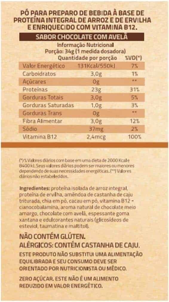 True Vegan Blend (Proteína isolada de arroz integral, proteína de ervilha), Amêndoa de castanha de caju triturada, chia em pó, cauca em pó, vitamina B12 – (cianocobalamina), aroma natural de chocolate amargo e chocolate com avelã, espessante goma xantana e edulcorantes naturais (glicosídeos de esteviol, taumatina e maltitol). NÃO CONTÉM GLÚTEN | ALÉRGICOS: CONTÉM CASTANHA DE CAJU. PODE CONTER SOJA E AMENDOIM.