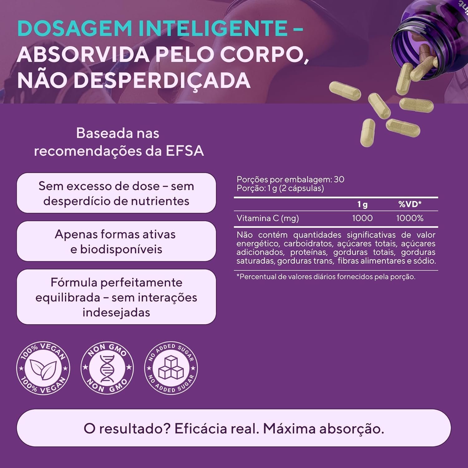 - 🧪 VITAMINA C EM CÁPSULAS VEGANAS – Forma prática e fácil de consumir, ideal para quem prefere suplementação em cápsulas ao invés de pós ou comprimidos.