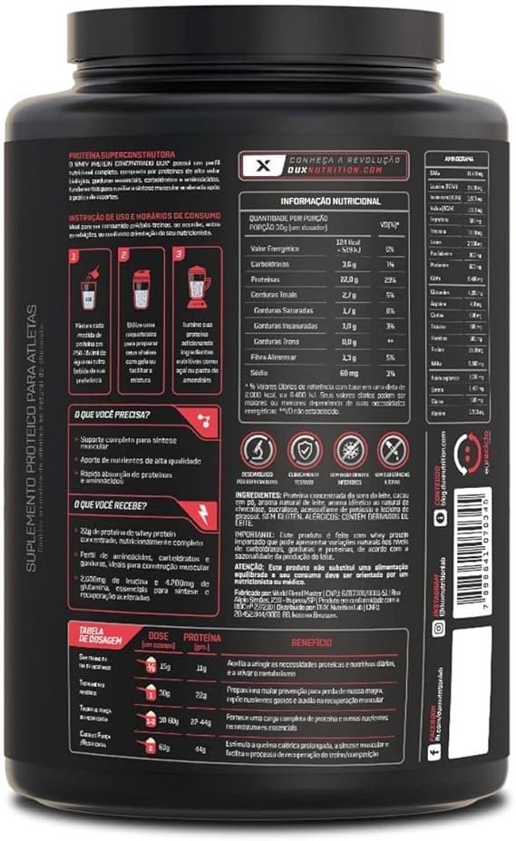 • O whey protein concentrado dux possui um perfil nutricional completo e um sabor real, ideal para ser consumido pré ós treinos, como um snack prático, ou em suas receitas