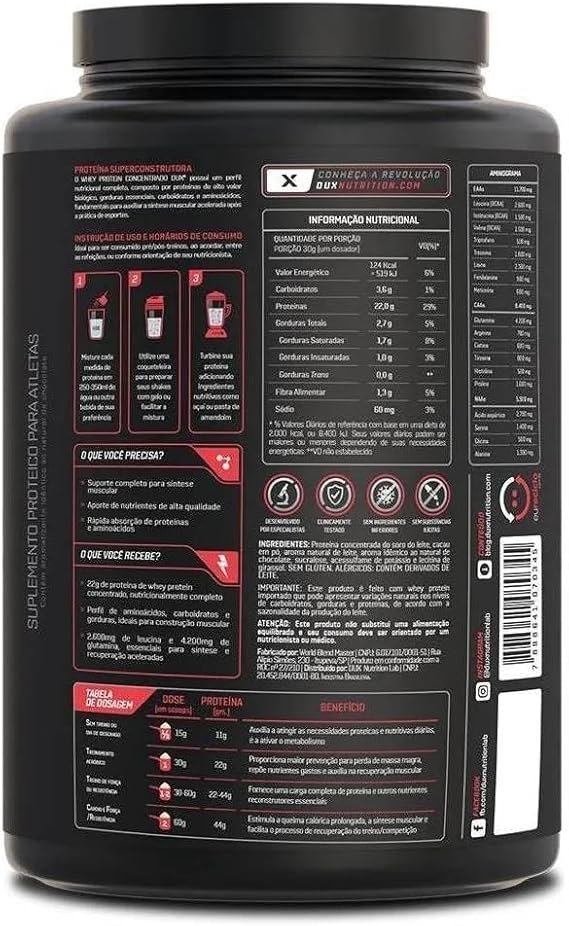 - 【ALTA QUALIDADE E ABSORÇÃO】Feito com ingredientes de alta qualidade, o Whey Protein Concentrado da DUX Human Health é uma fonte prática e eficaz de proteína, essencial para quem busca melhorar a performance física, sem aditivos artificiais.